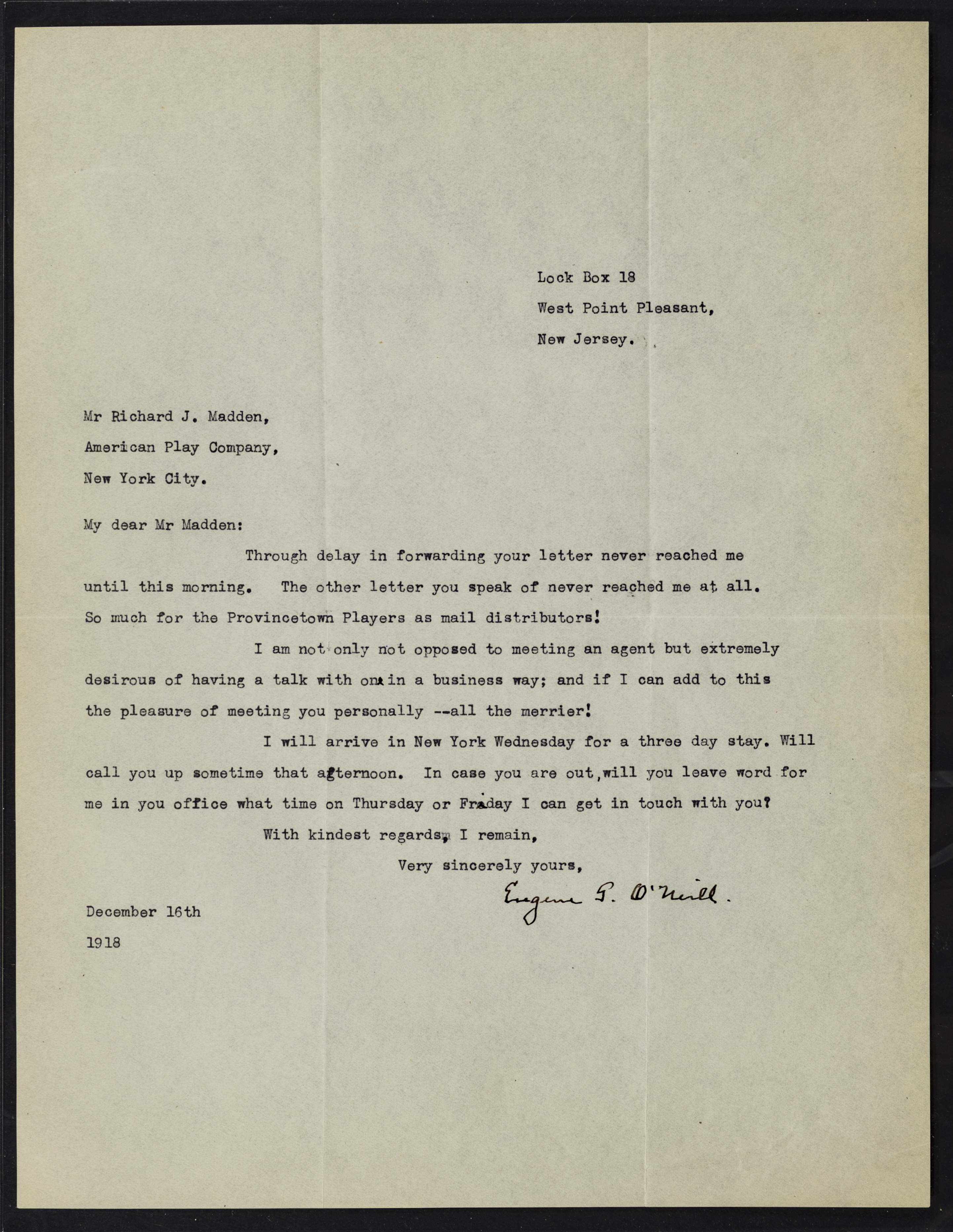 O’Neill, Eugene. Typed Letter to Richard Madden. eOneill.Com: An Electronic Eugene O’Neill Archive, The Assembled Playwright: Harley Hammerman's Eugene O'Neill Collection, accessed April 5, 2026, http://18.118.214.58/s/assembled-playwright/item/48505