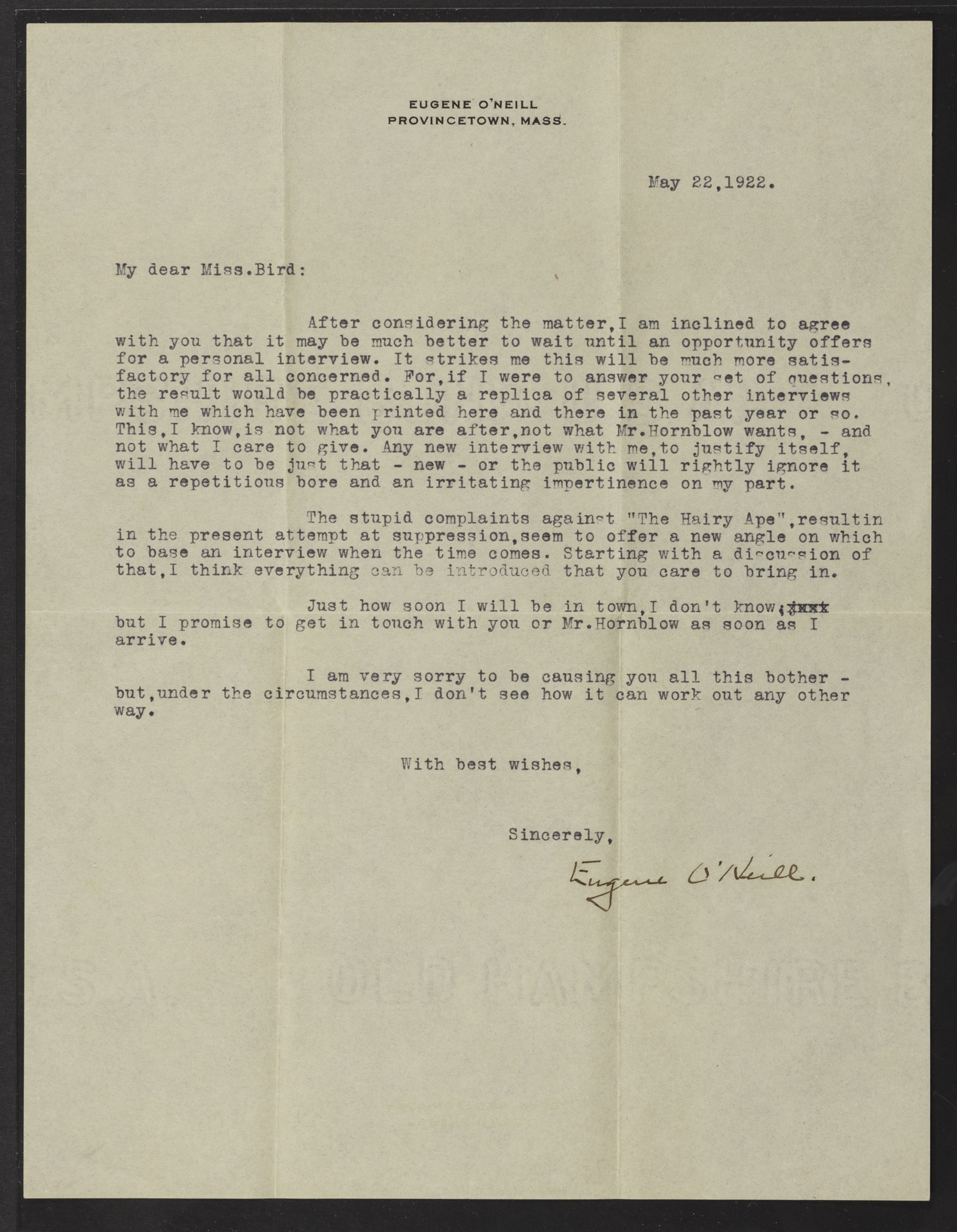 O’Neill, Eugene. 1922. Eugene O’Neill Typed Letter to Carol Bird. eOneill.Com: An Electronic Eugene O’Neill Archive, The Assembled Playwright: Harley Hammerman's Eugene O'Neill Collection, accessed April 5, 2026, http://18.118.214.58/s/assembled-playwright/item/48543