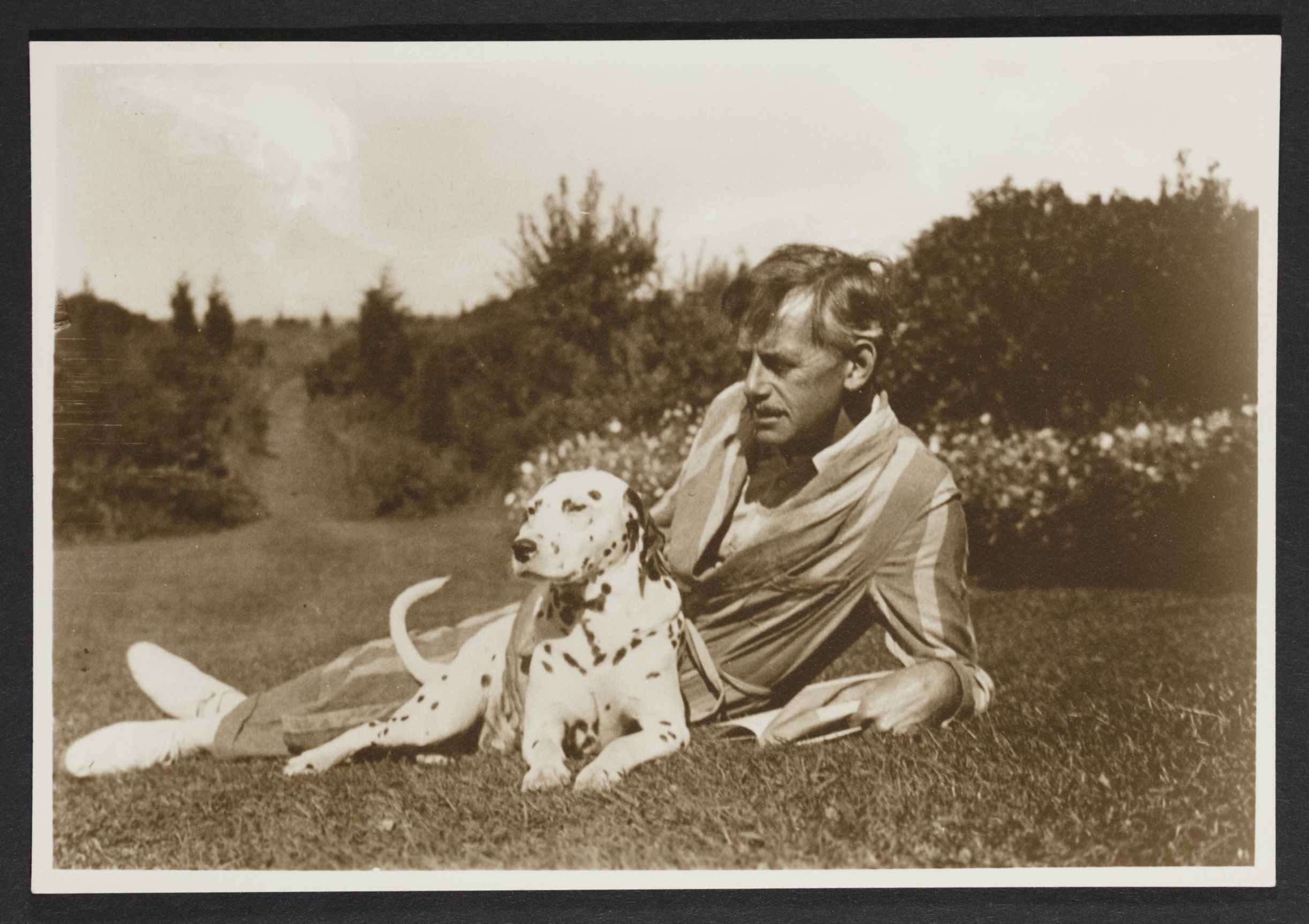 Eugene O’Neill Dressed in Robe, Lying on Grassy Hill With Blemie. 1931. eOneill.Com: An Electronic Eugene O’Neill Archive, The Assembled Playwright: Harley Hammerman's Eugene O'Neill Collection, accessed April 5, 2026, http://18.118.214.58/s/assembled-playwright/item/48572