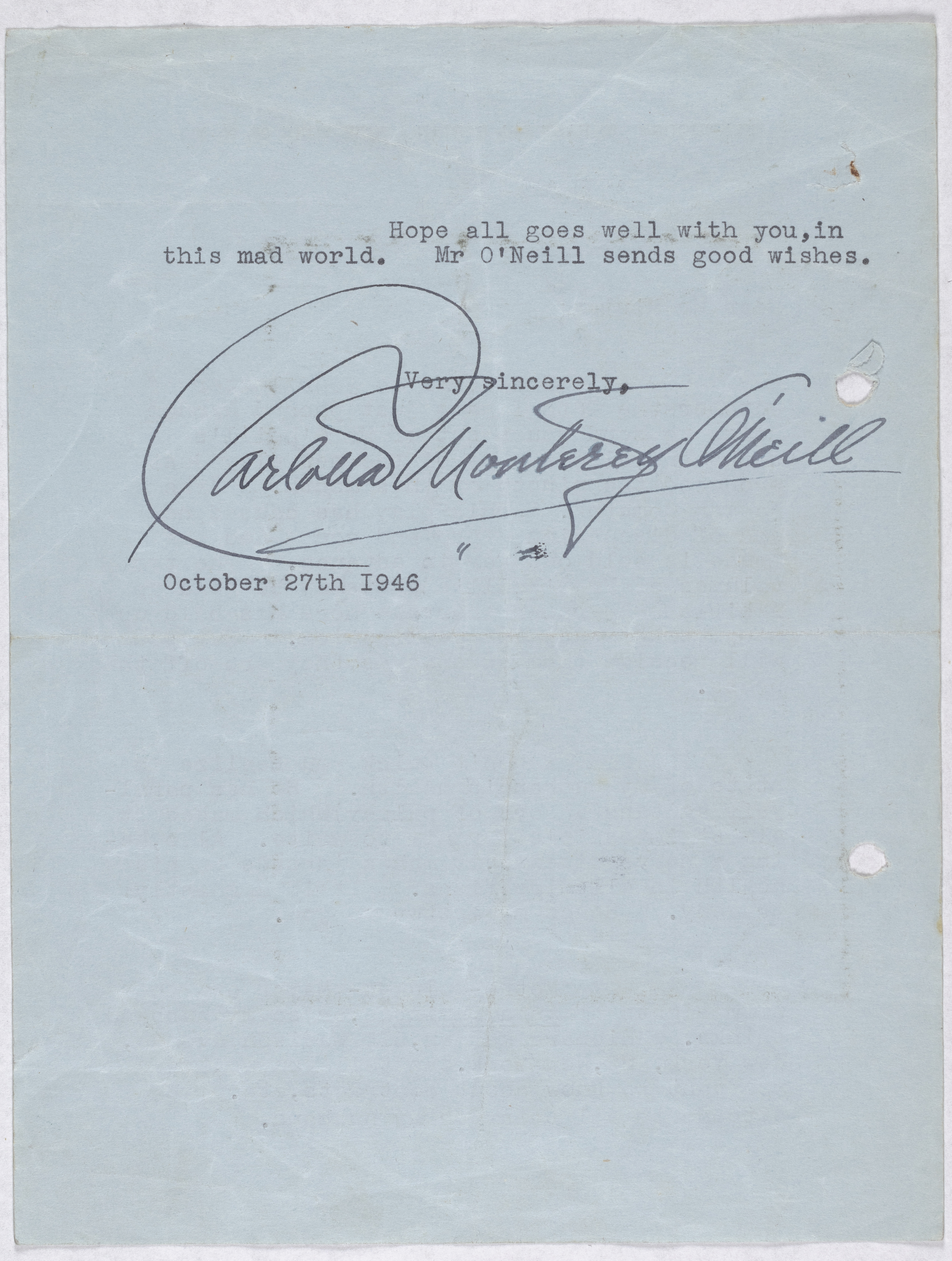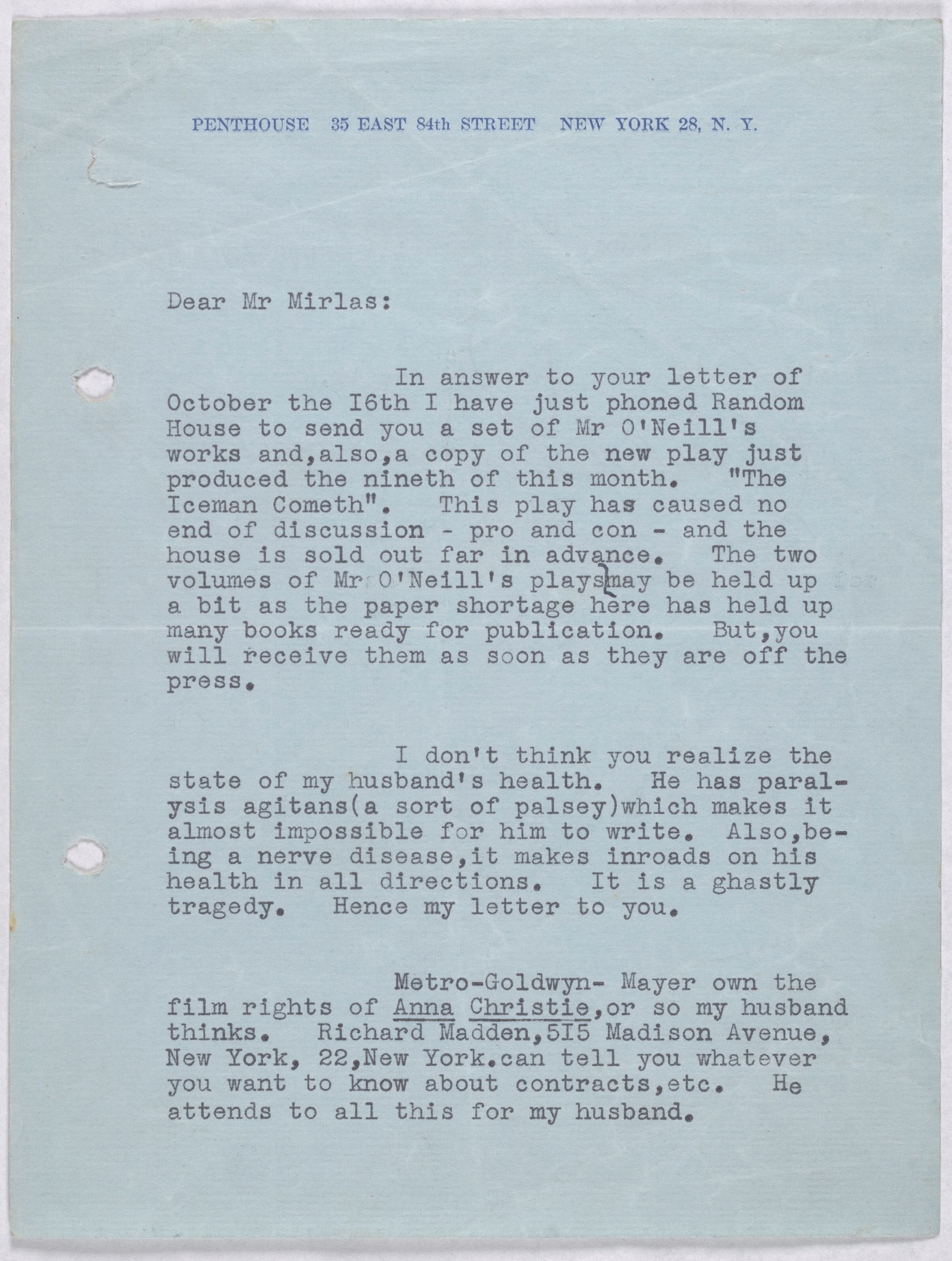 O’Neill, Eugene. 1946. Carlotta Monterey O’Neill to Leon Mirlas. eOneill.Com: An Electronic Eugene O’Neill Archive, The Assembled Playwright: Harley Hammerman's Eugene O'Neill Collection, accessed April 5, 2026, http://18.118.214.58/s/assembled-playwright/item/49391