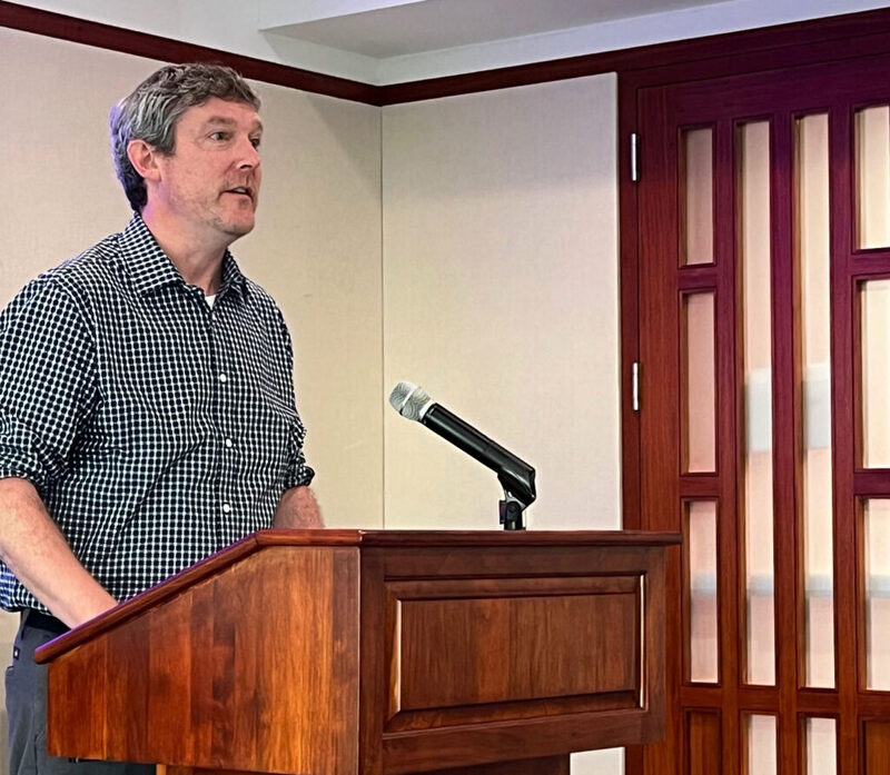 The day started with a talk by Ronán Noone, an award-winning playwright and adjunct faculty from Boston University. Noone’s talk focused on his just-published play, Thirst (TRW, 2023), which takes place in the kitchen of Monte Cristo Cottage during the events of O’Neill’s masterpiece, Long Day’s Journey Into Night. Noone discussed the process of creating the play while illustrating how the themes of deracination and immigration are considered essential to our understanding of O’Neill’s work.